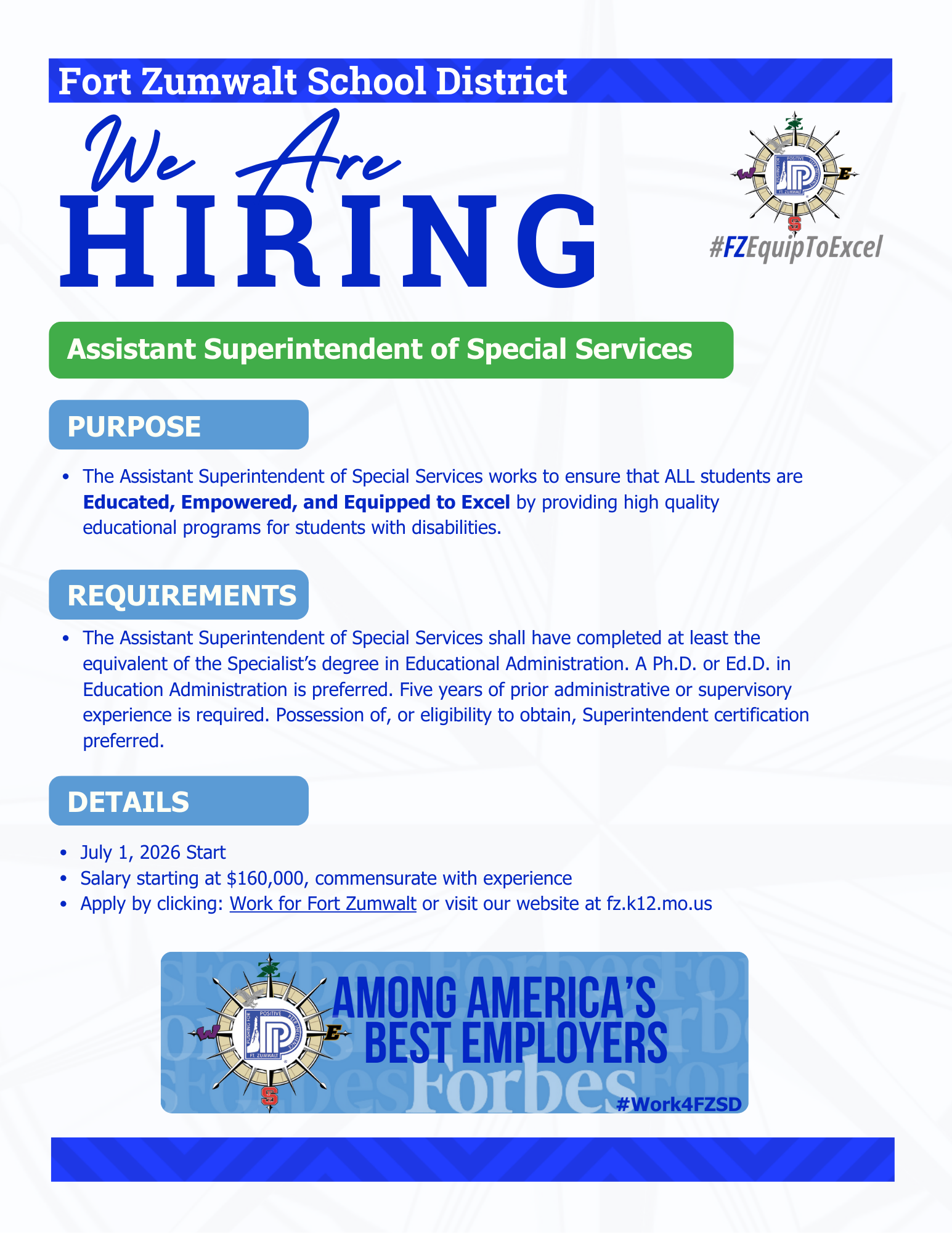 The Assistant Superintendent of Special Services shall have completed at least the equivalent of the Specialist’s degree in Educational Administration. A Ph.D. or Ed.D. in Education Administration is preferred. Five years of prior administrative or supervisory experience is required. Possession of, or eligibility to obtain, Superintendent certification